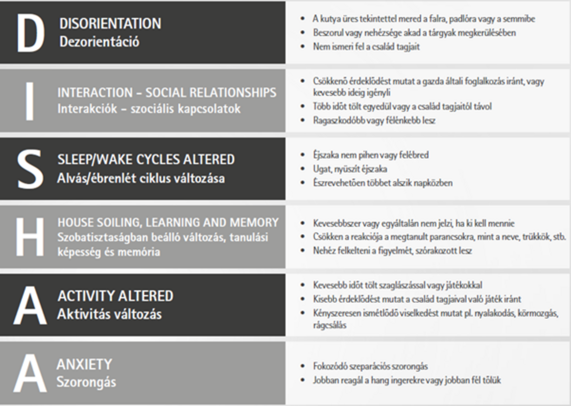 Azonban ha úgy tapasztaljuk, hogy ezek a változások hirtelen következnek be, vagy olyan tünetekkel is együtt járnak, mint az alvás-ébrenlét ciklus megváltozása, a ritkán látott ismerősök (állat és ember is) fel nem ismerése, a gyakoribb, ok nélküli ugatás, nyüszítés vagy a lakáson, kerten belüli céltalan sétálgatás, eltévedés, bútorok mögé beszorulás, felmerülhet bennünk az idősödéssel együtt járó kognitív funkcióvesztés tüneteggyüttesének (CDS) gyanúja.