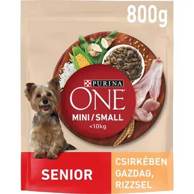 A Purina ONE Mini/Small Senior 8+ kifejezetten a 8 éves és annál idősebb kistestű kutyák számára lett kifejlesztve. Ízletes, csirkehúsban gazdag receptúrával, magas fehérjetartalommal és mérsékelt zsírtartalommal segíti az optimális kondíció megtartását, ezáltal támogatva az ízületek mozgékonyságát, valamint hozzájárul az egészséges fogazathoz és az erős csontozathoz, egy életen át.